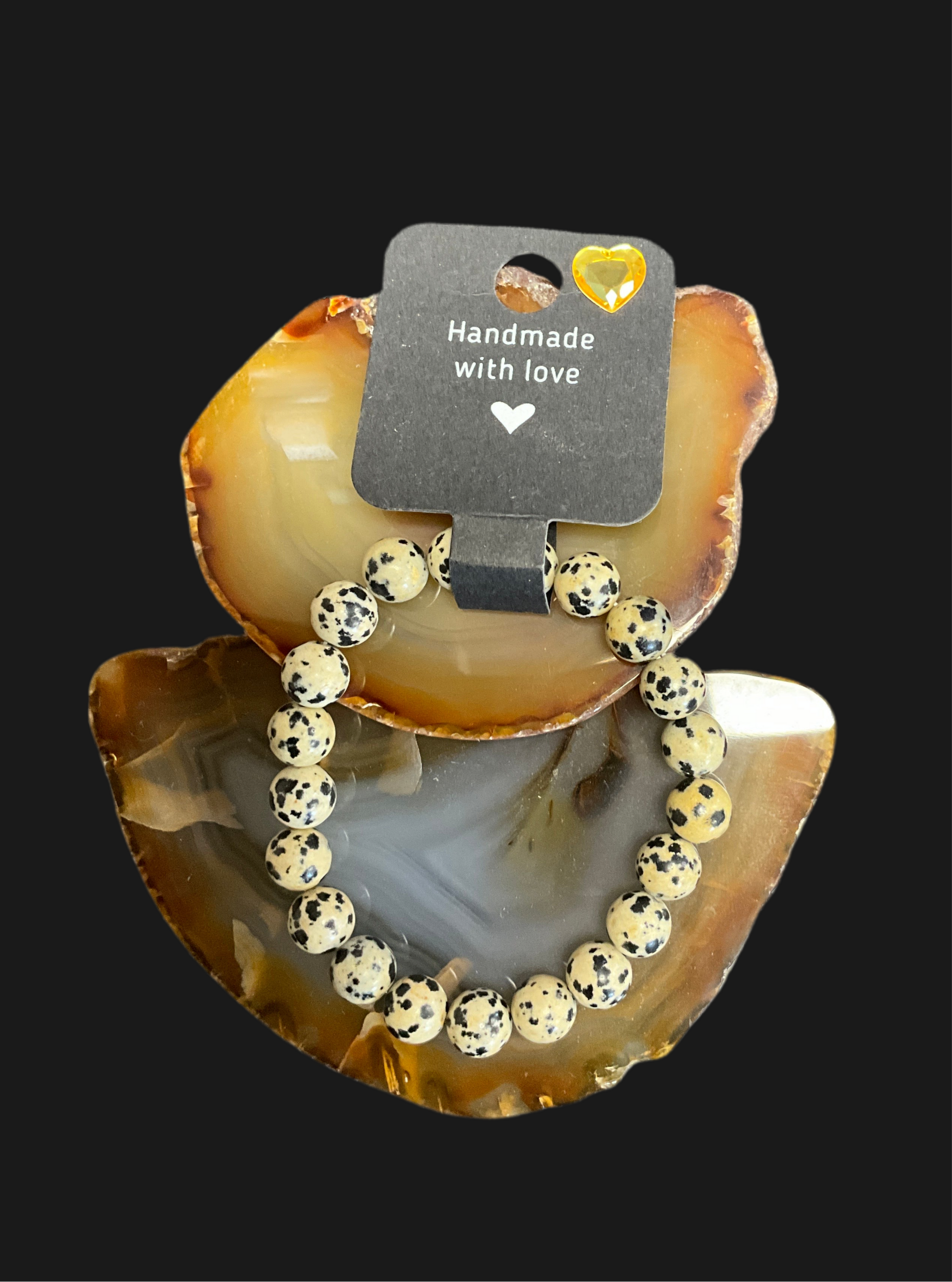 As a product expert, I present a beaded bracelet made of 6 3/4in dalmatian jasper. This unique and elegant accessory is crafted with natural stones, known for their calming and grounding properties. The perfect addition to your collection, it adds a touch of sophistication to any outfit.