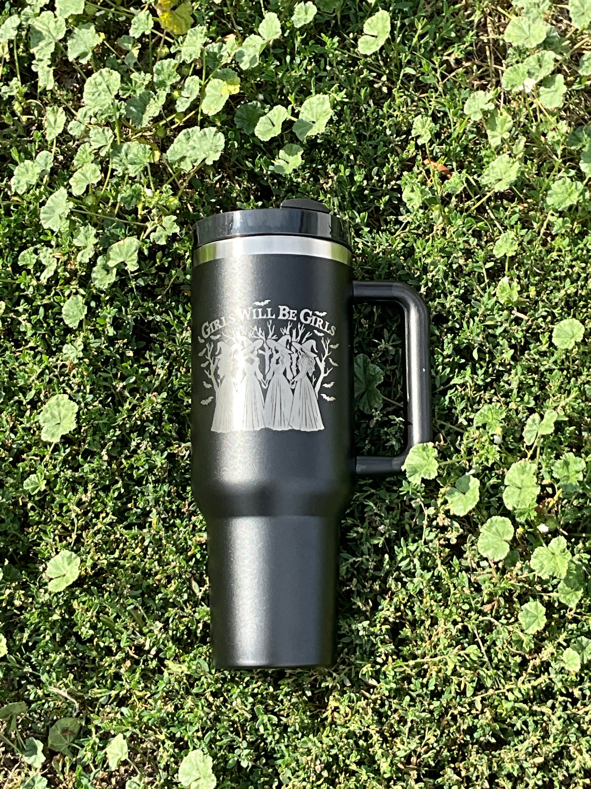 This 40oz tumbler featuring the phrase "Girls Will Be Girls" and a playful witch design is a perfect accessory for busy individuals on the go. Keep your drinks at the perfect temperature while showing off your unique style. Durable and versatile, it's a must-have for every workbench.