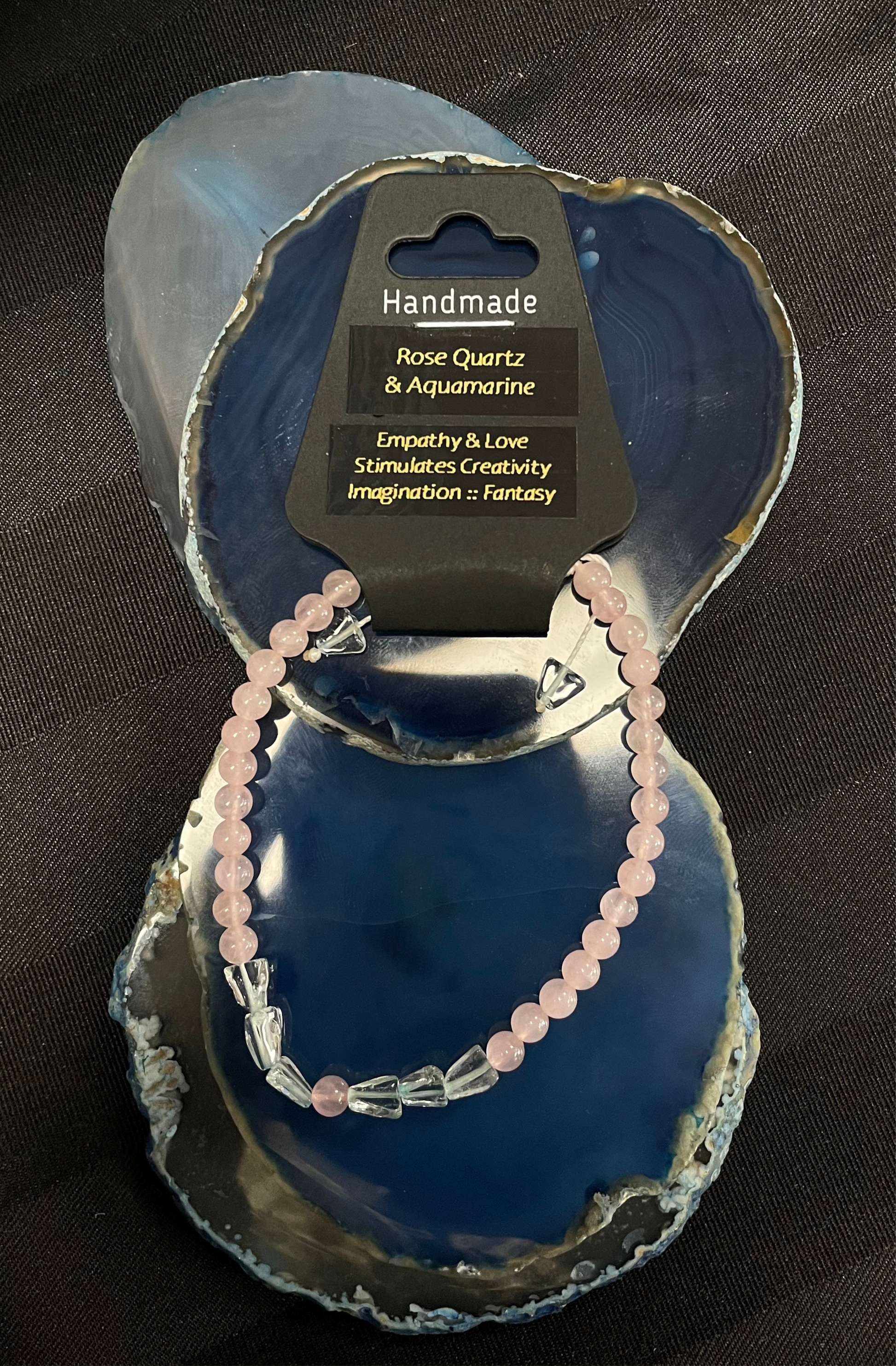 This handmade bracelet is crafted from the powerful healing stones of Rose Quartz and Aquamarine. These stones are known to promote love, compassion, and communication. Experience amplified vibrations for a more influential and positive energy.